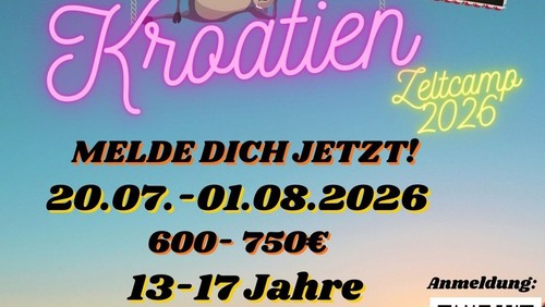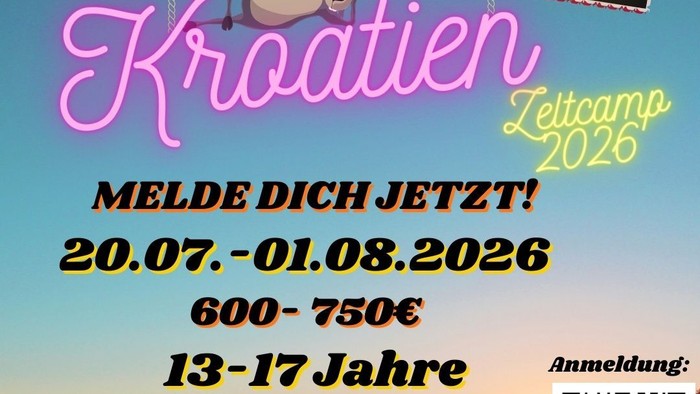 Vom 20. Juli – 1. August 2026 findet das Zeltcamp 2026 in Kroatien statt. Jugendliche von 13 – 17 Jahren können sich noch anmelden. Infos auch über WhatsApp 01578 0919028
